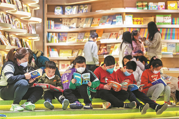 Parents and children read and select books at Wangfujing Bookstore during the Spring Festival holiday in January.a book at a Zhongshuge branch bookstore in Beijing's Xicheng district on Feb 15.[Photo provided to China Daily]